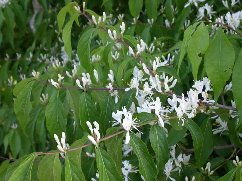 - Kaartuvahaarainen pensas, valkoiset tuoksuvat kukat, punaiset marjat.