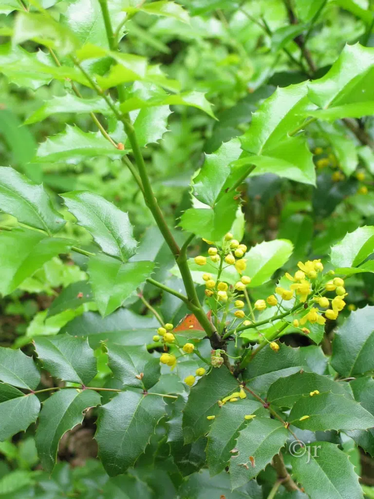 Den vintergröna lågtväxande mahonian blommar i maj med stora upprätta klasar i grupper med små gula men vackra blommor. Mahonians blad är ofta glänsande och vackert mörkt gröna med på sidorna tvärt avsmalnande småblad. En del av bladen kan färgas röda på hösten.